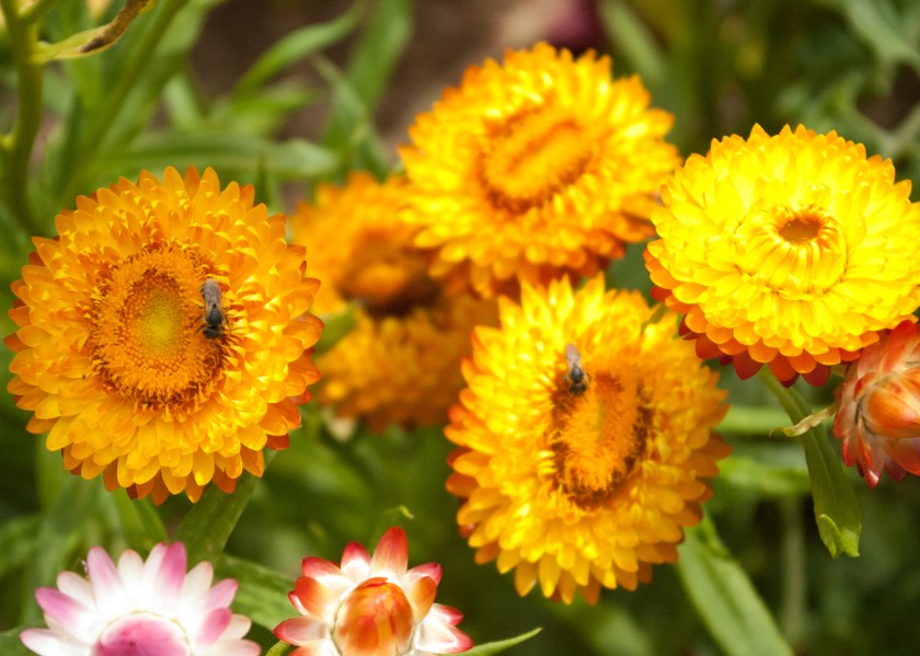 As you can see, even though the flower petals (actually they are bracts) may be papery and appear unwelcoming, they produce nectar at their base that’s very attractive to a wide range of bees even before the flower is entirely open for pollinating. One interesting note about strawflowers: like many plants, its botanical name has changed over the years, and you may find it listed as either Xerochrysum bracteatum, its current, ‘correct’ name, or Helichrysum bracteatus, its older name. Native to Australia, strawflowers are one of those fabulous annuals that will bloom until a hard frost here in Canada.