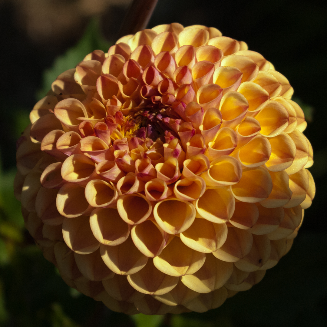 picture of a Dahlia flower - honey rust colour, large pom pom flower
