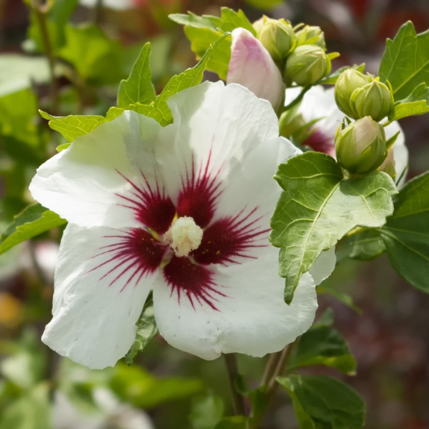 A cluster of Rose of Sharon flowers, white with a burgundy centre