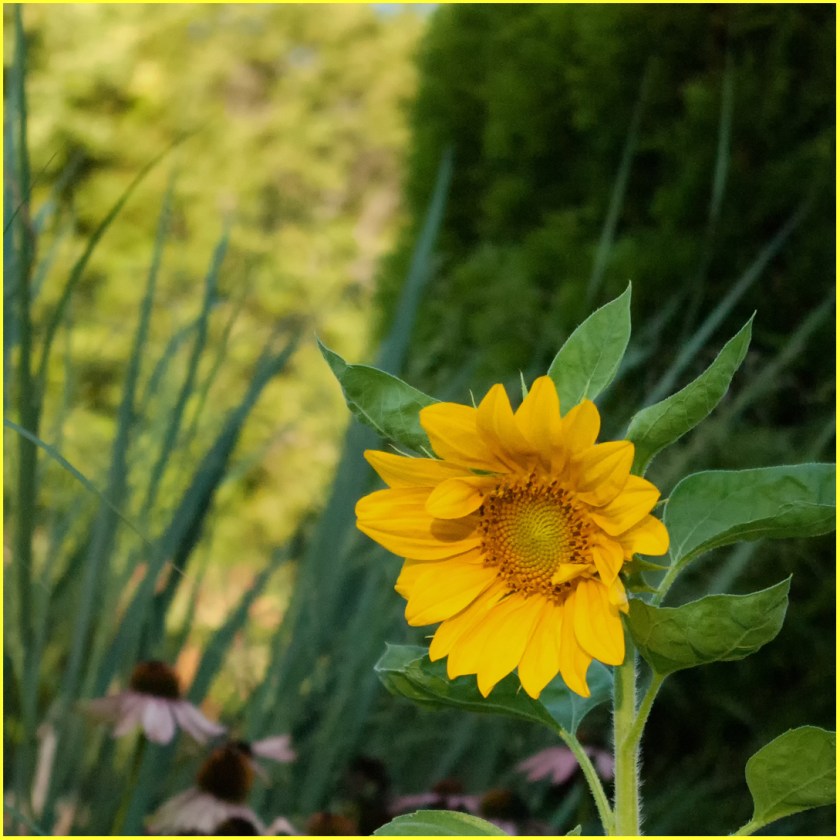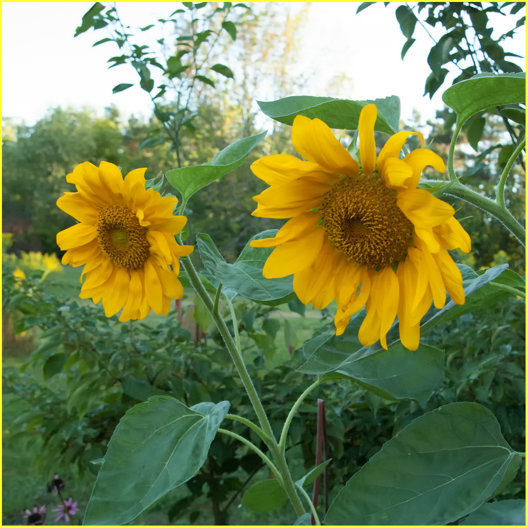 A had a few early sunflowers this year, volunteers that sprouted in April and were in full bloom by the end of June. Only one of the seeds I actually planted in the garden even germinated, and it was nipped in the bud, so to speak, when it was only a few inches high, So I started a half dozen in pots in early July, and transplanted them when they were about six inches tall. Then it stopped raining. These sunflowers should be quite a bit larger than this, but hey, the blue jays won’t mind when they get to chow down on the seeds in a few weeks!