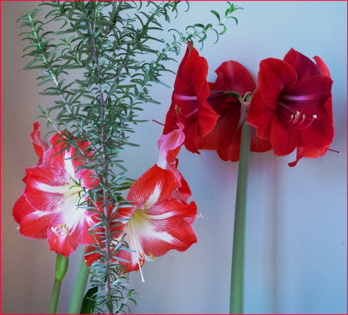 Sorry – no cat photos. But we adopted two in the spring, only to discover a) that they loved to nibble on any foliage that they can reach, and b) many house plants are poisonous. So out went most of my indoor tropicals, either because they soon looked too tatty to tend to, or I was too fearful for my new feline friends. I have just a small handful left, including these two Amaryllis (Hippeastrum) that have bloomed for many years. They (plus the Rosemary I brought in for the winter) sit on a high table, catching a bit of sunshine, guarded on the edge of the table by a ring of potted, spiny succulents. We’re only through a third of winter but so far cats and plants are safe.