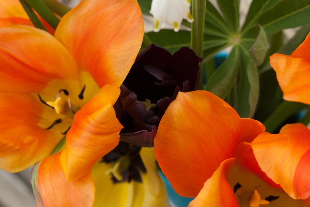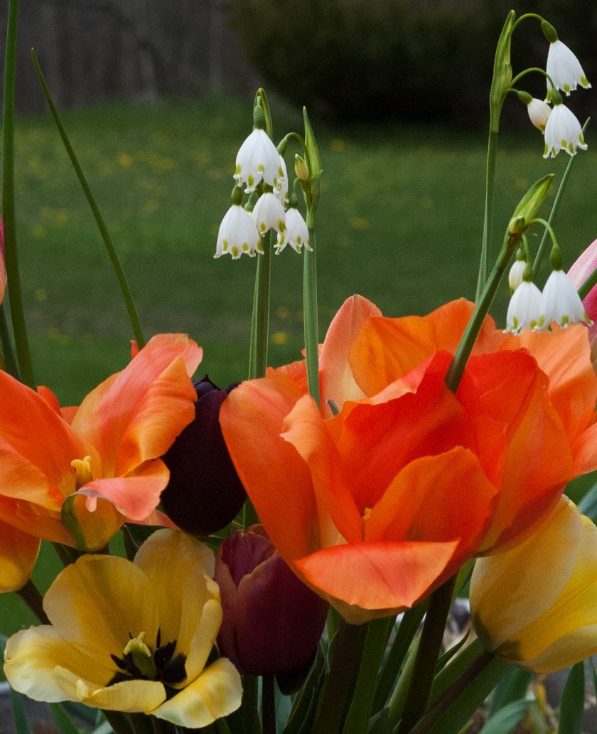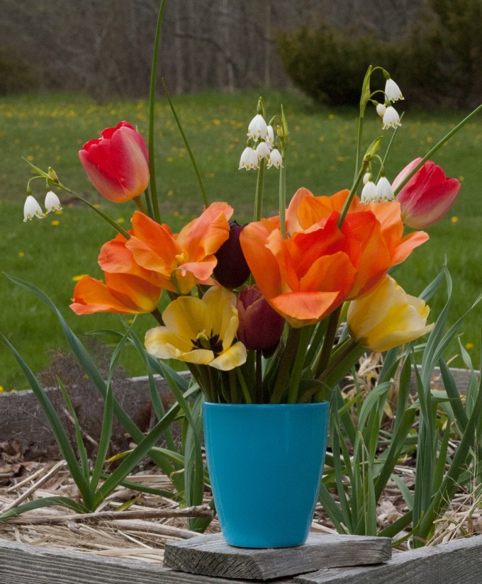 My first attempt at a vase of tulips looked a bit flat. The tulips were gorgeous, yes, but something felt missing, so I went back into the garden and snipped a few long pieces of garden chives (Allium schoenoprasum), a single leaf from a Lupine plus several tall Summer Snowflake (Leucojum aestivum). The graceful, delicate, nodding flowers of the latter add some dignity to the roughness of the vase, I think, as well as beauty, and I hope it’s a fitting tribute to Cathy’s sister Janet. Cathy hosts a weekly gardening meme on her site, Rambling in the Garden, where she she encourages gardeners around the world to bring a bit of the beauty from the natural world indoors.