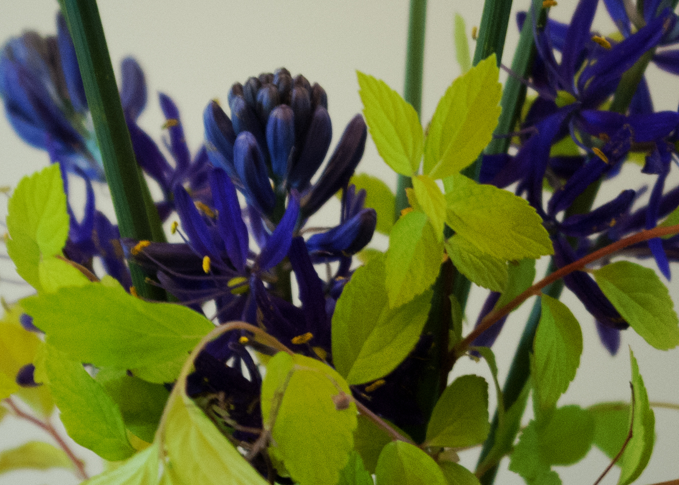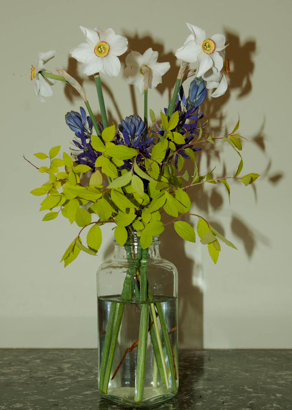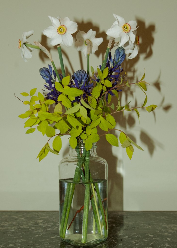 I put together a smaller vase on Saturday morning, just before the skies opened. It also has the Poet’s Narcissus, this time with the deep blue (cobalt? Cerulean?) Camassia quamash. As a filler I cut a few twigs of Goldmound Spirea – its early spring foliage is so bright I thought it echoed the Camassia anthers, as well of course as the daffodil cup.