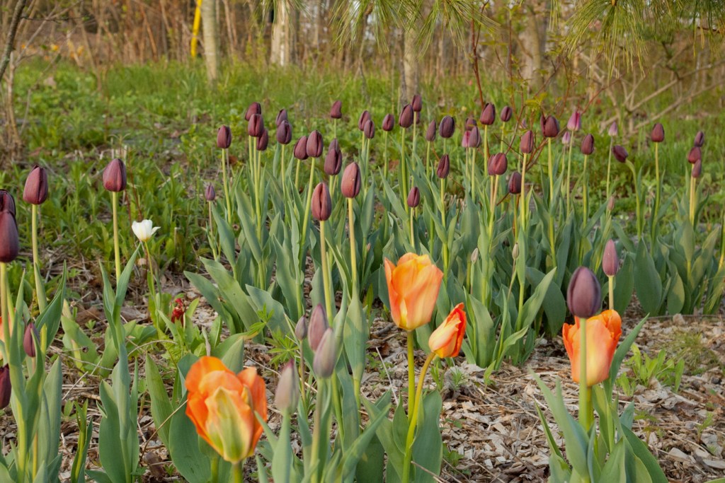 Here’s the spot in the garden where I planted all these gorgeous deep purple tulips last fall — I’m really impressed with the height of their stems – they’re much taller than most other tulips I’ve grown.