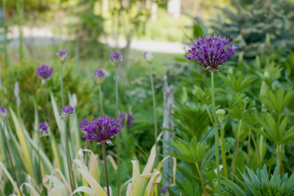 The larger Alliums have started to bloom, including ‘Purple Sensation.’ For me, its only drawback is how the leaves start to yellow and die almost the minute the flower starts to open. It’s unsightly – but only for a few weeks.