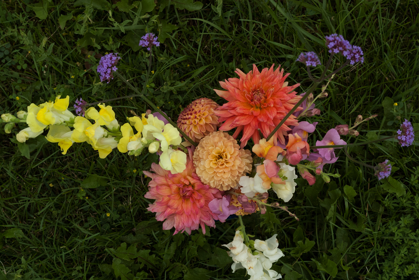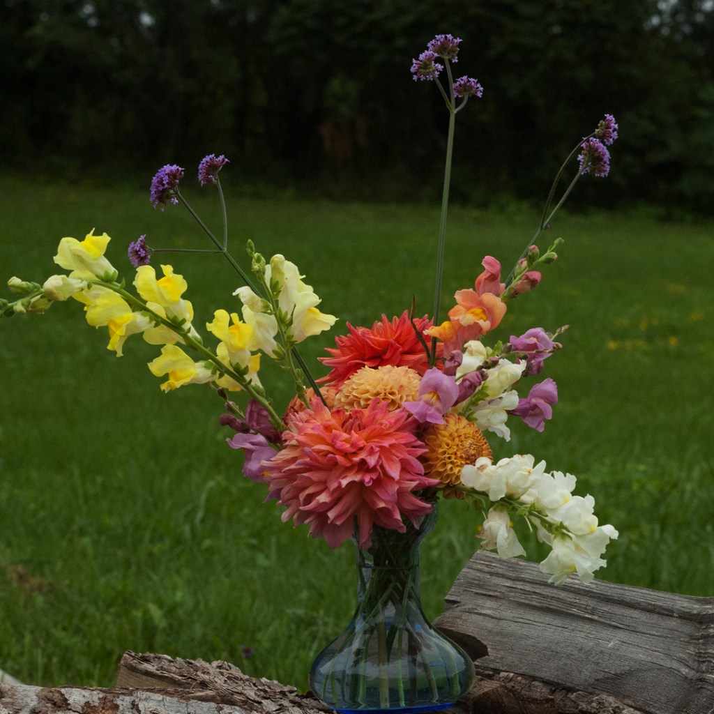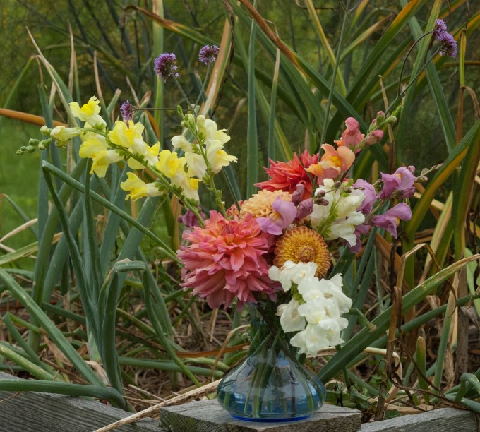 I don’t know what it is about dahlias, but given good light and the right camera settings, they are about the most photogenic flower going. And since August is, almost by definition, Dahlia Month in certain parts of the world, I’m once again joining Cathy at Rambling in the Garden with a vase of cut flowers, once again showcasing Dahlias. This time, they’re in combination with Snapdragons (Antirrhinum sp.) and Verbena bonariensis. It’s rainy today so I’m glad I cut the flowers and photographed them last Friday at noon, when it was cloudy.
