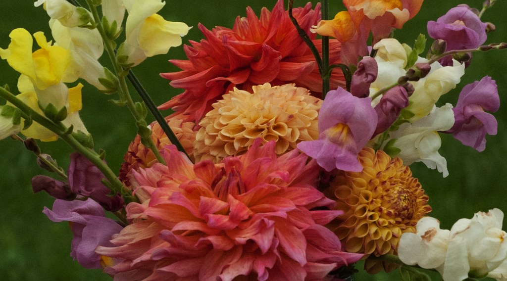 A lovely combination that’s hard for me to imagine. My snapdragons would have to hold on a lot longer or my dahlias would have to bloom much earlier – or both things might have to happen at once!