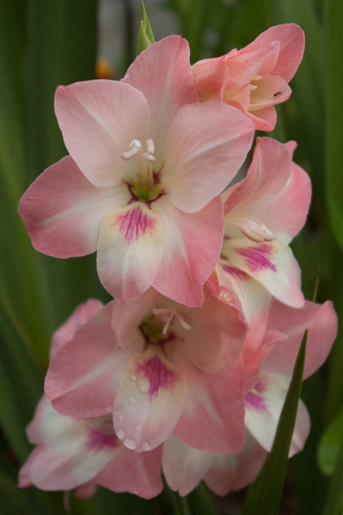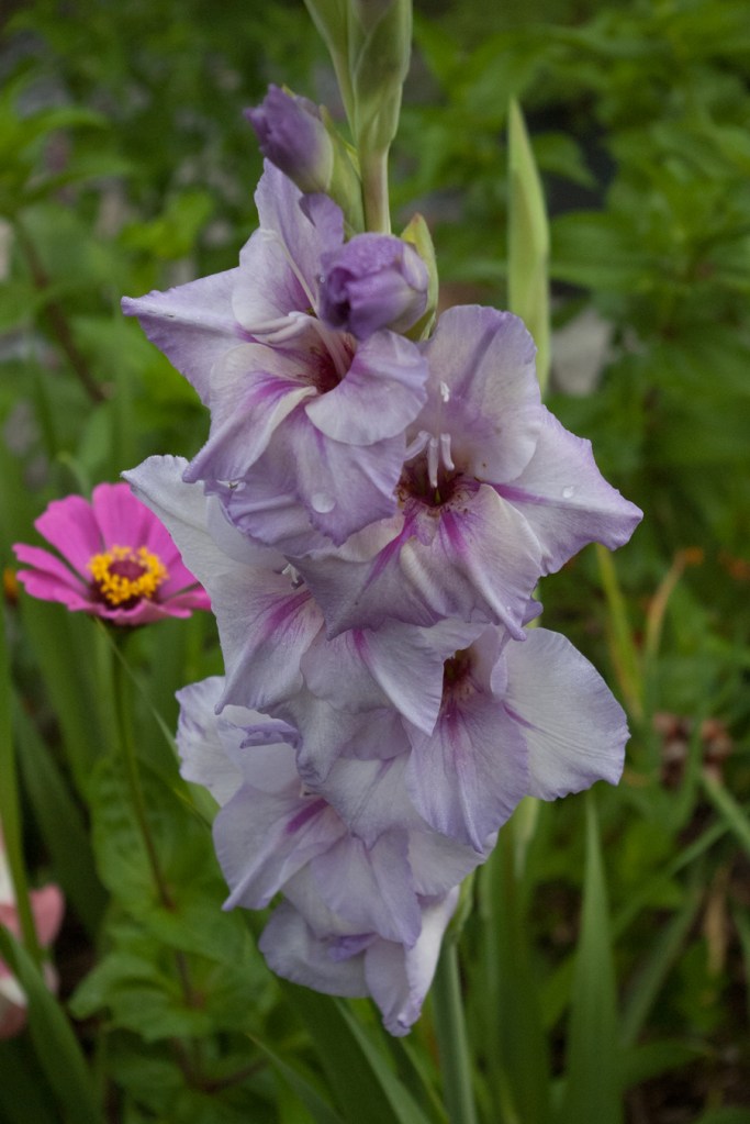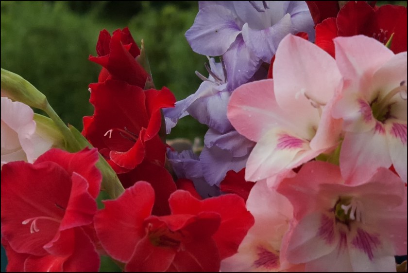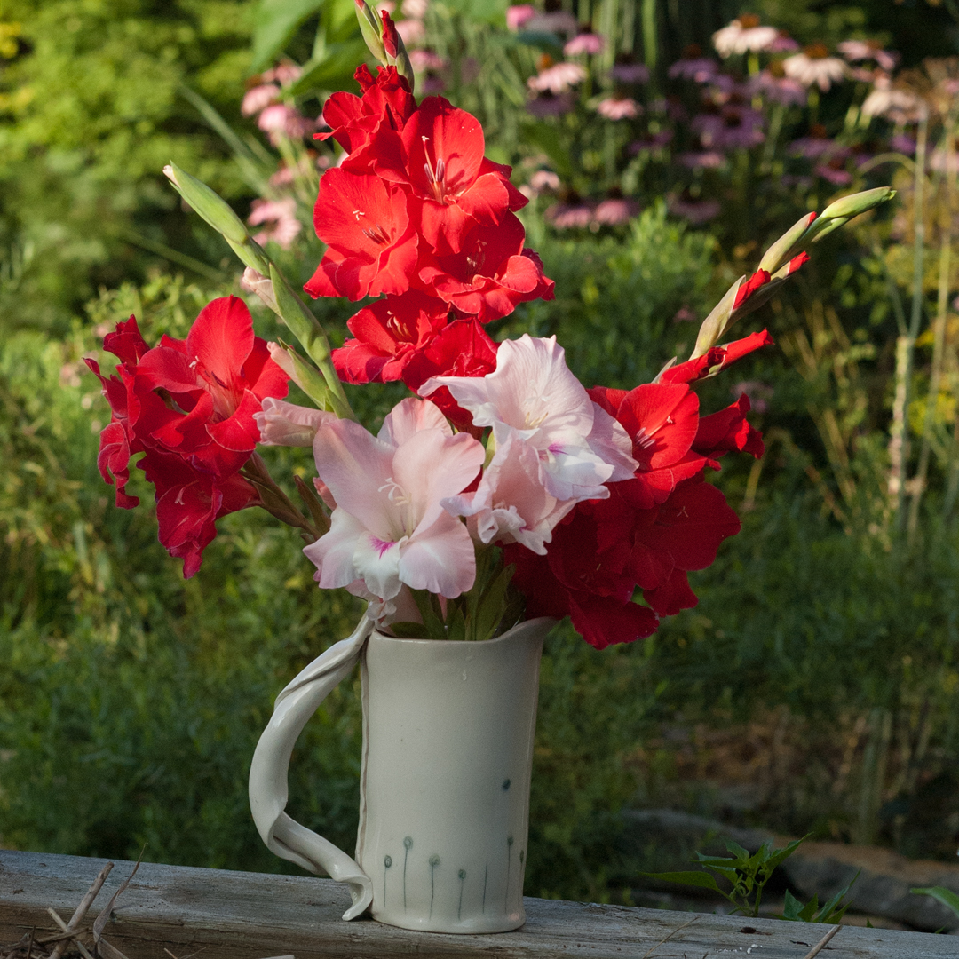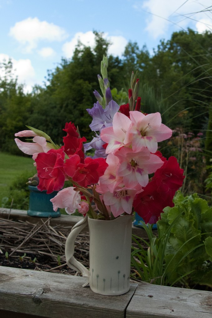 Joining my kitchen windowsill collection of flower-filled smallish vases this past week has been a jug of severely cut down gladioli. I love glads – their colour tones, structure, how they open from the bottom, allowing you to pull off fading blooms but still keep the flower stalk going as higher up blooms open. I plant a few dozen every year in a dedicated spot of the kitchen garden. I love how they emerge somewhat haphazardly – at different angles (no, I don’t stake them) and send up flower stalks at different times. (yes, I hold back some bulbs for later planting, hoping for staggered blooms into late summer).