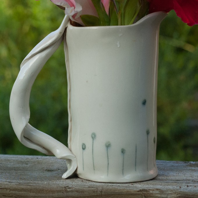 Here’s the vase I’m using – an artsy ceramic jug gifted me by a dear friend who today is decamping the County to start a new life in Spain. Moving continents has meant much divestiture of ‘things.’