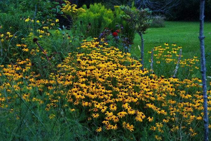 I’ll end with a pair of wider shots to better display the masses of Black Eyed Susan – Rudbeckia fulgida I think – that are now in full bloom. These do well in full sun or semi-shade and spread easily and quickly via seed or rhizome and, in my garden at least, need to be edited lest they overwhelm everything else. Their downside is they’re not very drought tolerant; many years they look quite crispy in mid summer and wind up editing themselves! Have a great weekend everyone!