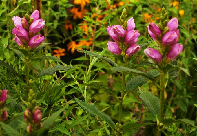 Pink Turtlehead (Chelone obliqua) was also suddenly open on Thursday, looking very photogenic and just waiting for bumble bees to force their way into their innards.