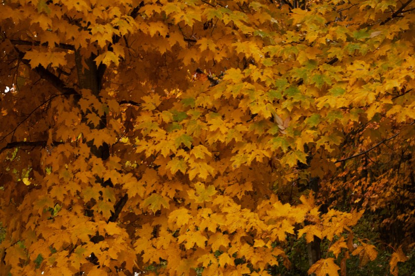 The leaves on that maple, and a few others in its immediate vicinity, have an interesting life cycle. In just a few weeks they’ll go from full, normal green, to starting to turn brown as if they’re about to fall off, to turning the brilliant yellow I captured a few days ago, to becoming a soft orange, to flying off in the wind, which is happening today.