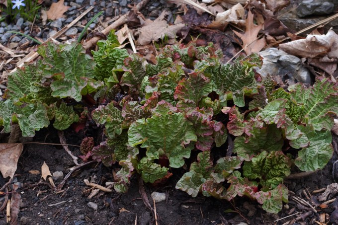 My rhubarb has finally begun to move. The wrinkled yellow green leaves were in a holding patter for weeks, but finally they are green and the stalks begin to lengthen. I will make a crumble and be very happy!