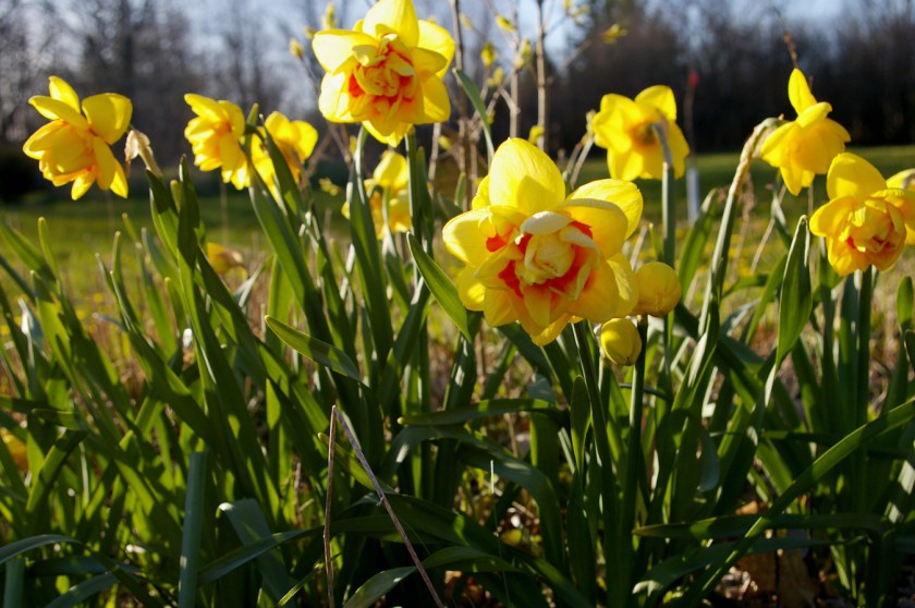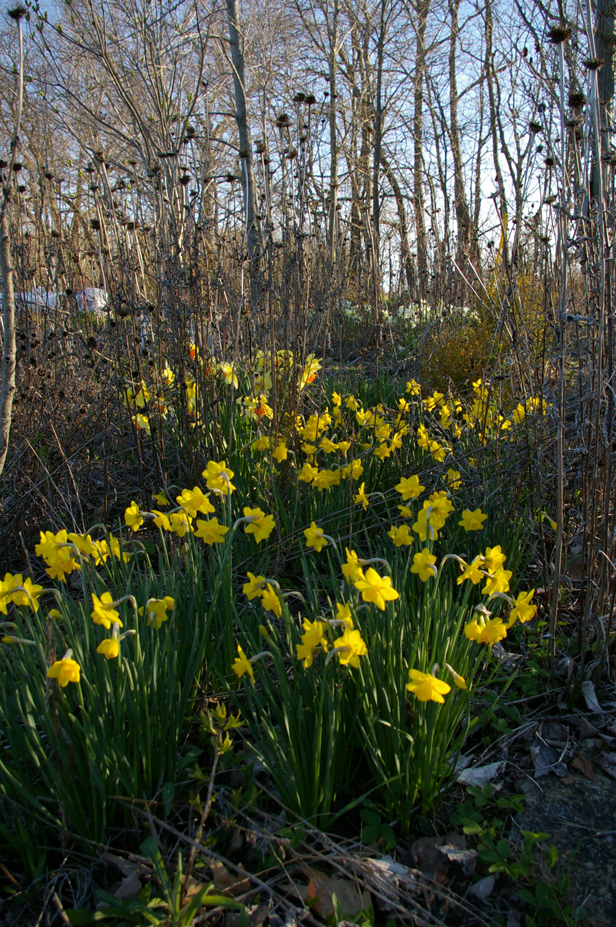Daffodils, as I mentioned, are still the main attraction here, including ‘Quail’ (tall stems, small flowers, sometimes more than one per stem, strong Paperwhite fragrance), ‘Tahiti’ (medium height, flouncy rounded yellow petals with bits of orange stuck in them), and an unnamed, shortish daff with pale petals and a small yellow cup.