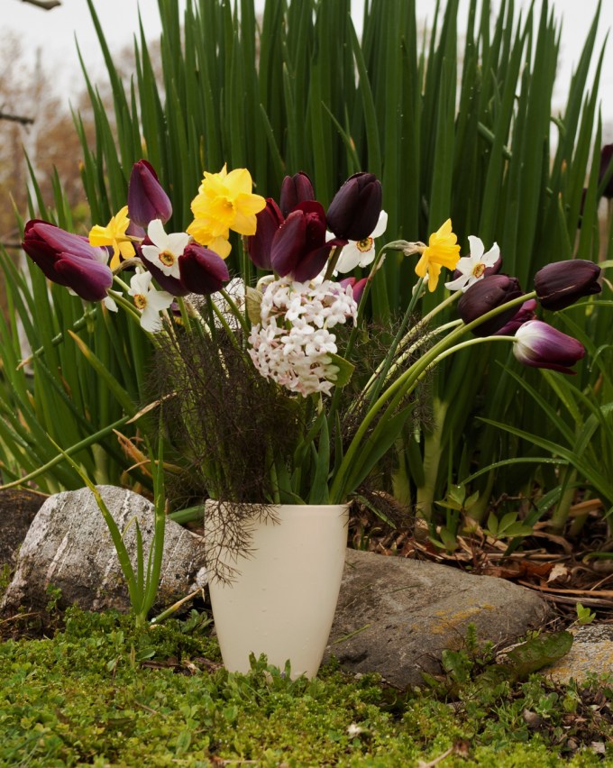 I couldn’t resist the fragrance of Korean Spice Viburnum (V. carlesii) mingling with the similar smell of Narcissus Poeticus yesterday, and added a few of the last Narcissus ‘Quail’ – equally but differently smelling – and some bronze fennel fronds. These joined a clutch of tulips – ‘Queen of the Night’ and ‘Pittsburgh’ – to create an olfactory and purply, slightly damp, vase this week, joining Cathy at Rambling in the Garden.
