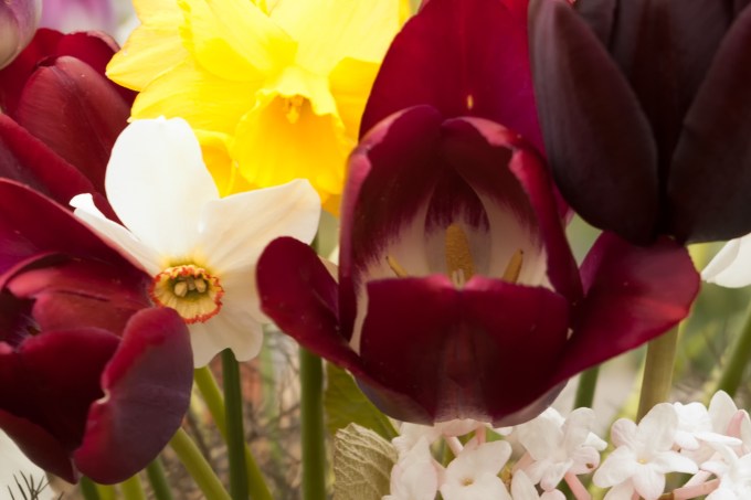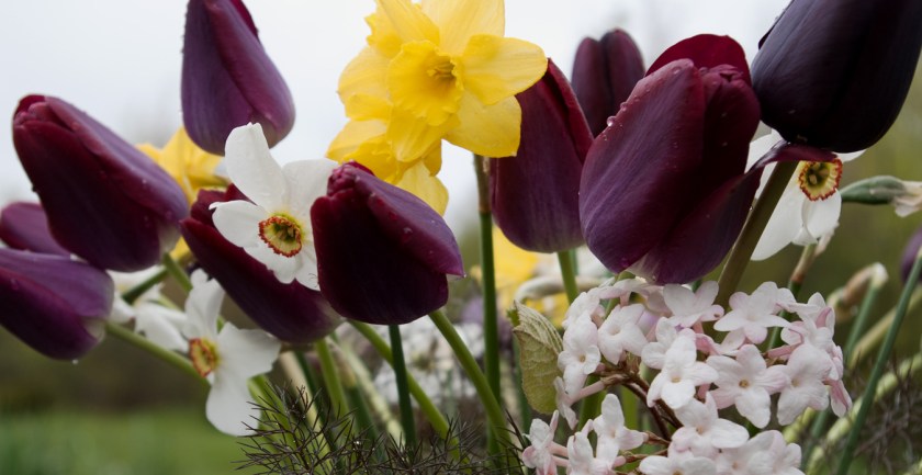 A lovely mix! I wouldn’t be able to resist cutting a bit of Viburnum carlesii either! But the narcissi are just a bit too potent for me indoors. The dark tulips make for a bit of drama. 😃