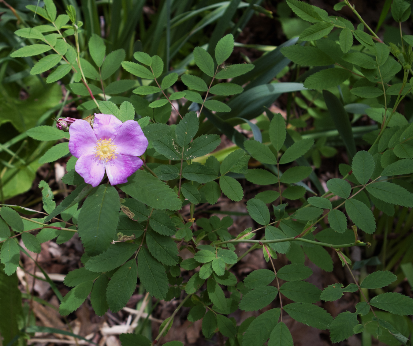 The flowers should magically transform into small rose hips later this summer, and the shrub spreads by suckering, I’ve read, so likely not ideal for a cultivated flower garden. It seems ideal where I’ve seen it growing wild – at the side of roads in semi-shade. I’m going to help this little one along, clearing away the buckthorn and wild raspberry that it’s crowded amidst, and hope for a few more blooms next year.