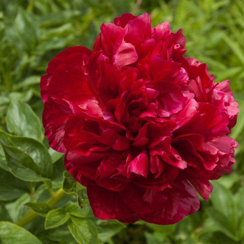 Peony season has started here in Ontario; in my garden it starts with this unknown, luscious but fragrant-free double red. It has thick strong stems but the flower itself is so heavy I’ll find them bent to the ground after a rain.