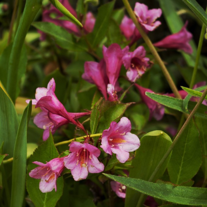 Through no fault of its own, this dwarf Weigela florida ‘Minuet’ has never grown more than eight or 10 inches (20 – 25 cm) high, when it should be at least three times that size by now. It keeps getting nibbled away by rabbits in the winter, leaving only a few small branches come spring. None the less it gives us a few flowers every year, like these. Yes, I’ll definitely remember to protect it with chicken wire or buckthorn branches this fall…