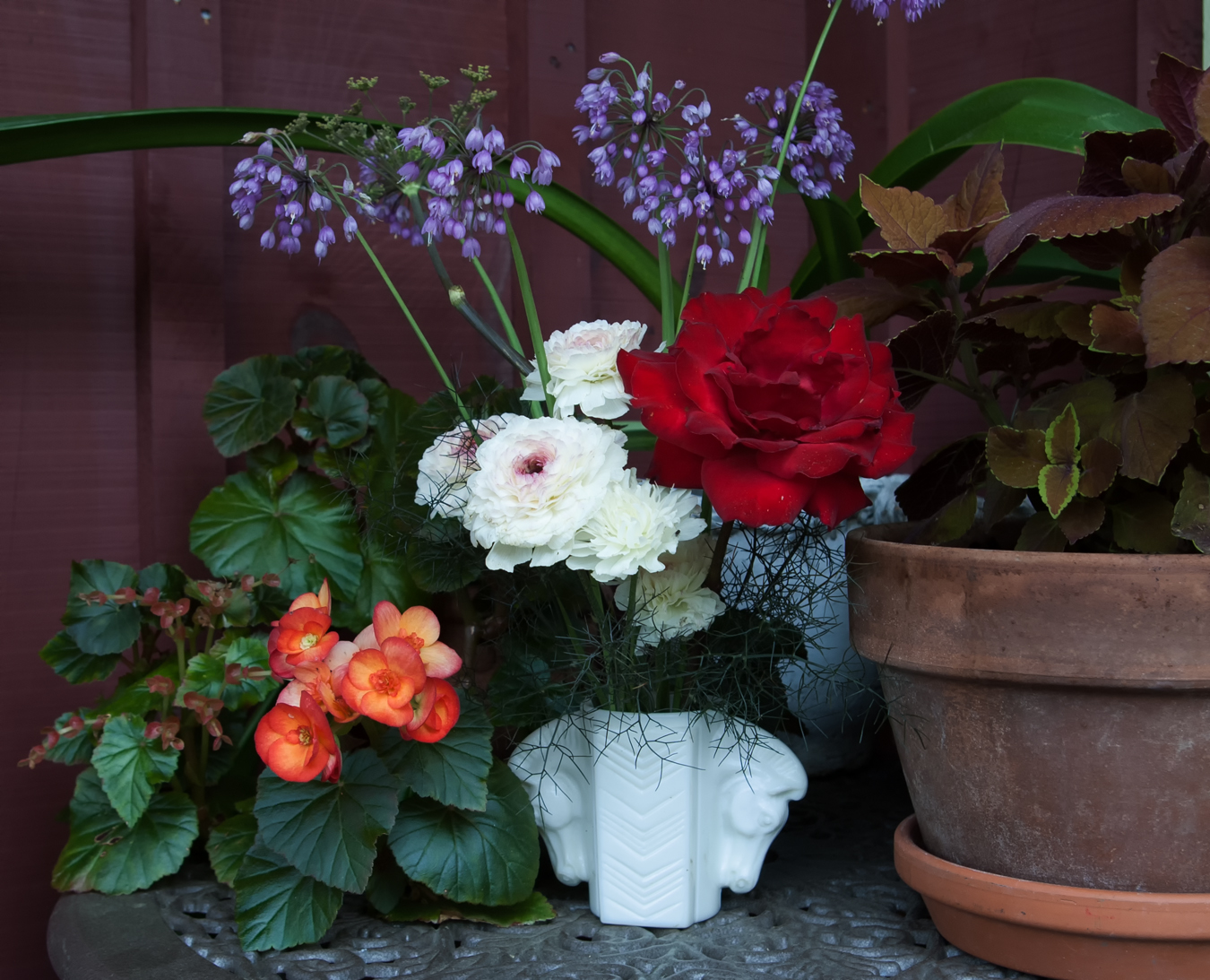 But the sun came out, the Ranunculus opened a bit more, and I brought the little art deco milk glass cup onto the back porch, to join a few other plants in another flower photoshoot. This little table gets just a few hours of morning sunshine – perfect for the Begonia and Coleus.