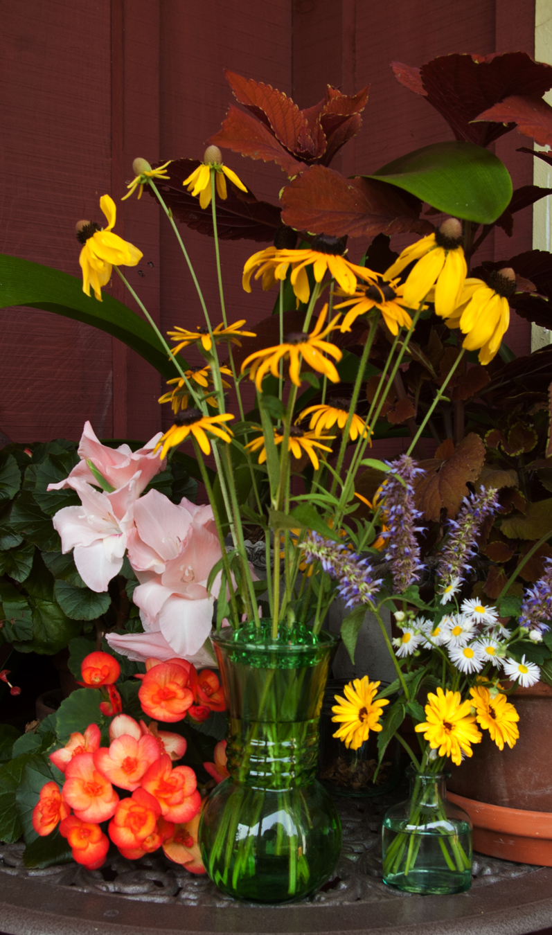 Every Monday Cathy at Rambling In The Garden encourages us to share a vase highlighting what’s growing in our gardens; at the end of July, there’s plenty of blooms to choose from and my back porch cafe table is jammed with small jars and vases jostling for space amongst the ever growing resident Begonia and Coleus. The strappy Amaryllis (Hippeastrum) leaves you see are about to disappear — I’m going to move their pots to a dark dry spot in an attempt to force the bulbs into dormancy before a (hopefully) Christmas bloom.