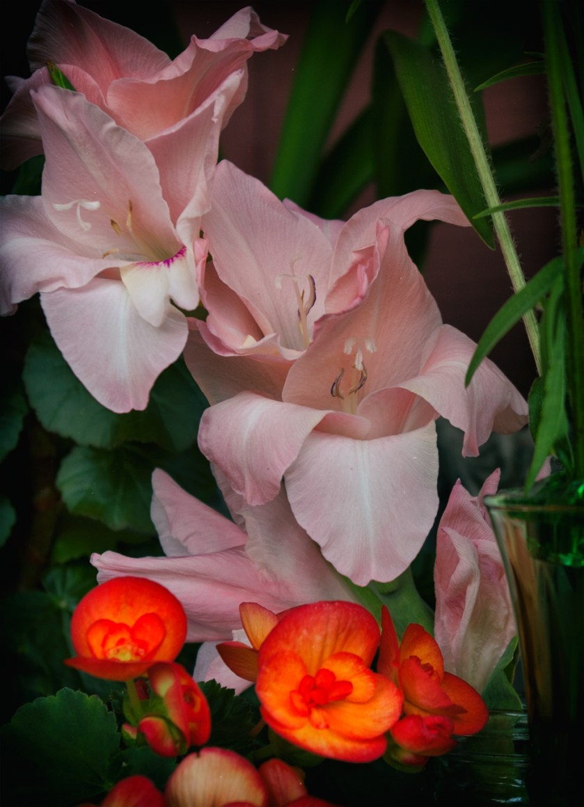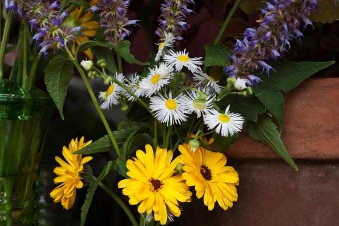 The soft pink gladiola is a garden casualty – I discovered the stem lying on the ground Friday afternoon, nipped or broken off, I’m not sure, but very wilty. The flower petals perked up after a night in water though, so here it is, the small jar it’s in hidden, but an integral part of this floral tableau. The tall green vase with its top mounted frog has Rudbeckia and Ratibida pinnata (the later shown more closely in yesterday’s post), while the very small bottle has Agastache, Calendula and Erigeron annuus – the native fleabane that pops up unobtrusively all over the countryside here.