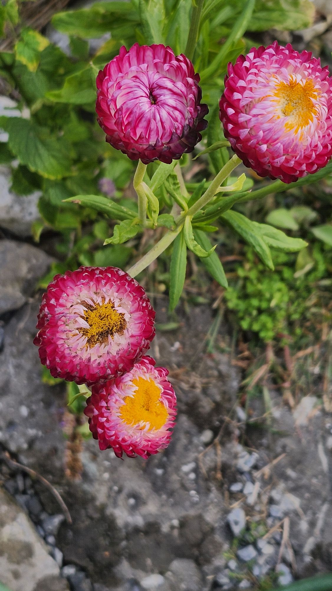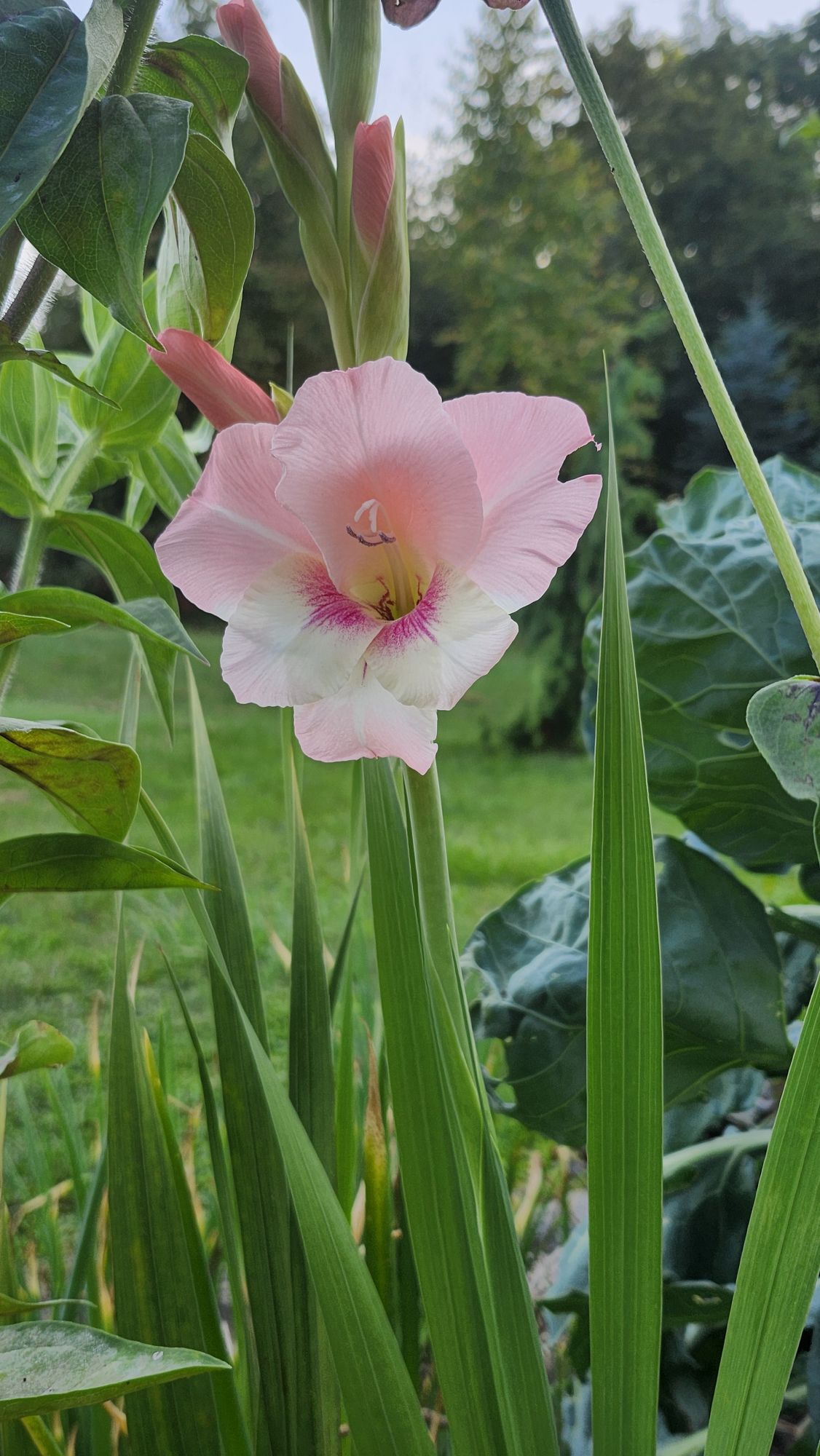 2 pinks for 2 different flowers: the pretty pale pink of this gladiolus and the flashy pink of the strawflowers: I really like both of them
