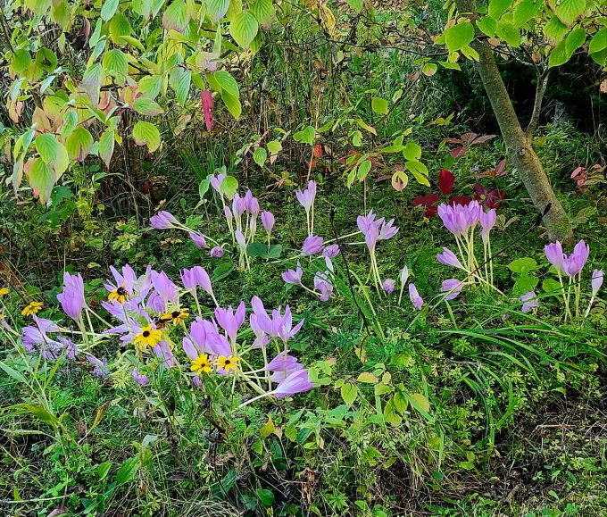Aside from the asters, the last thing to bloom in my garden are Colchicum – sometimes called autumn crocus (although there is another autumn crocus, with a much smaller bulb and flower from which saffron is harvested). They’re quite lovely in several spots around the yarden this weekend, including here, the original patch, under a pagoda dogwood. Have a great weekend everyone!