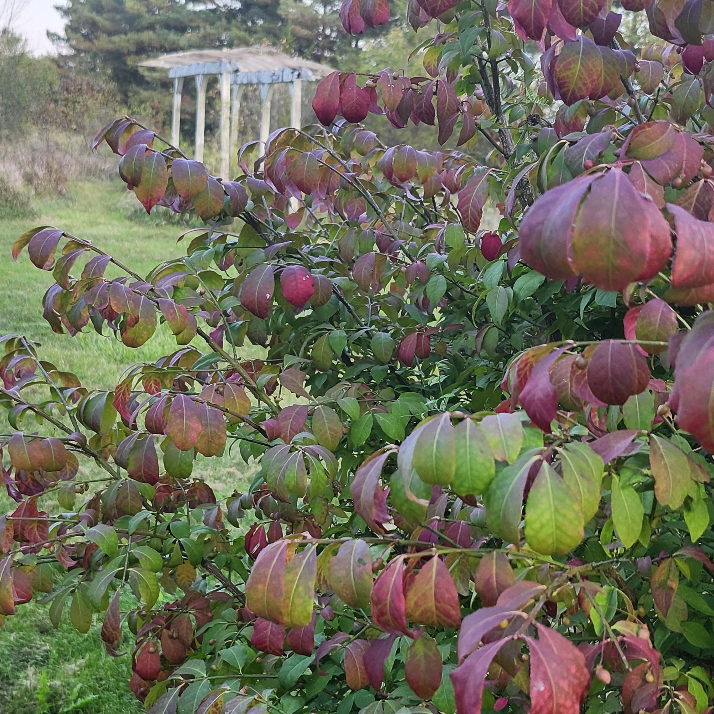 A yarden suggestion: in the Burning bush photo, that white structure would be perfect, if you put some nails at the top and bottom of the posts, then some thick twine, then pots of Thunbergia and Morning Glories……