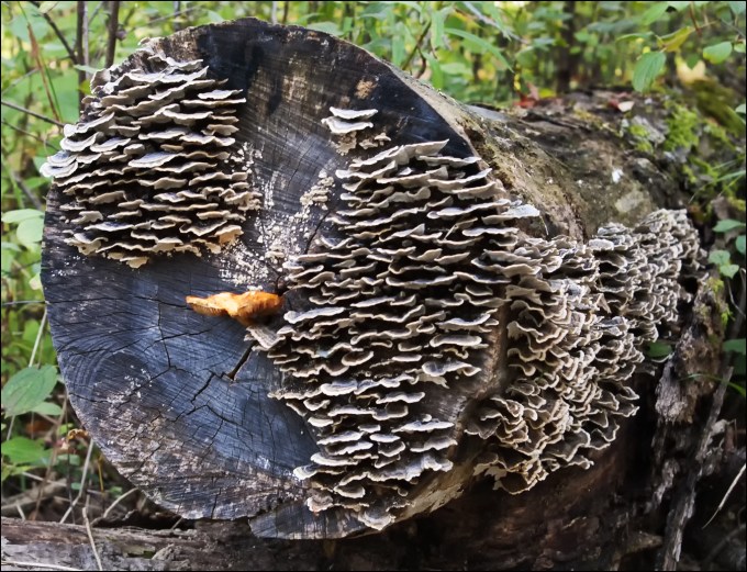 The bottom of the cut log looks like a butterfly with a differently-colored body. It even has two bits of fungi to mark the ends of its antennae. LikeLiked by 1 person