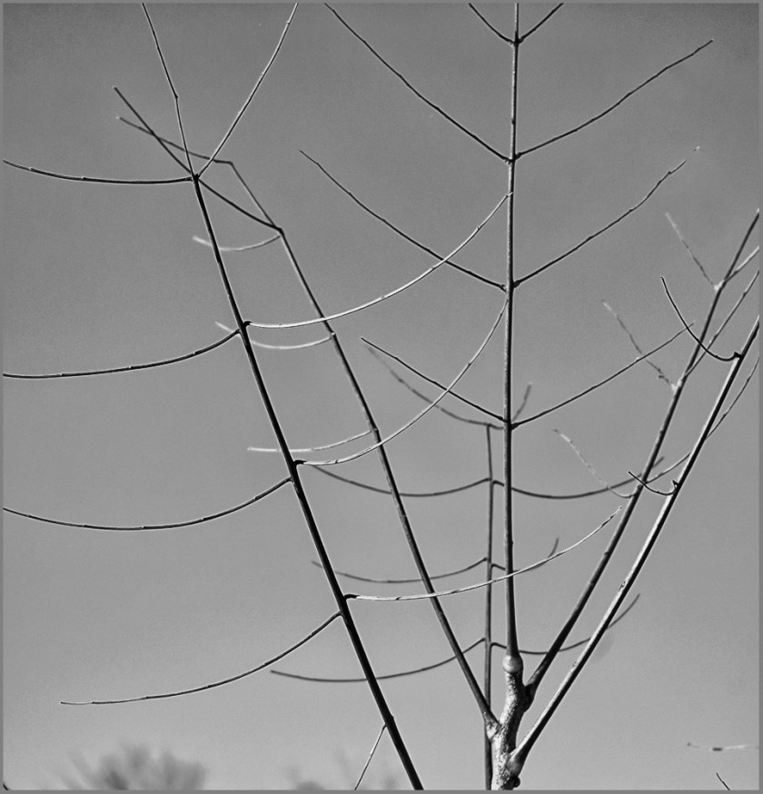 LOL! To me they brought visions of tall ships’ sailing masts…. Interesting, those ‘branches’ are the remains, the skeleton, of that tree’s doubly compound leaf – they were covered with small leaflets in the summer.