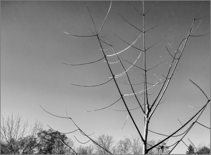 LOL! To me they brought visions of tall ships’ sailing masts…. Interesting, those ‘branches’ are the remains, the skeleton, of that tree’s doubly compound leaf – they were covered with small leaflets in the summer. LikeLiked by 1 person
