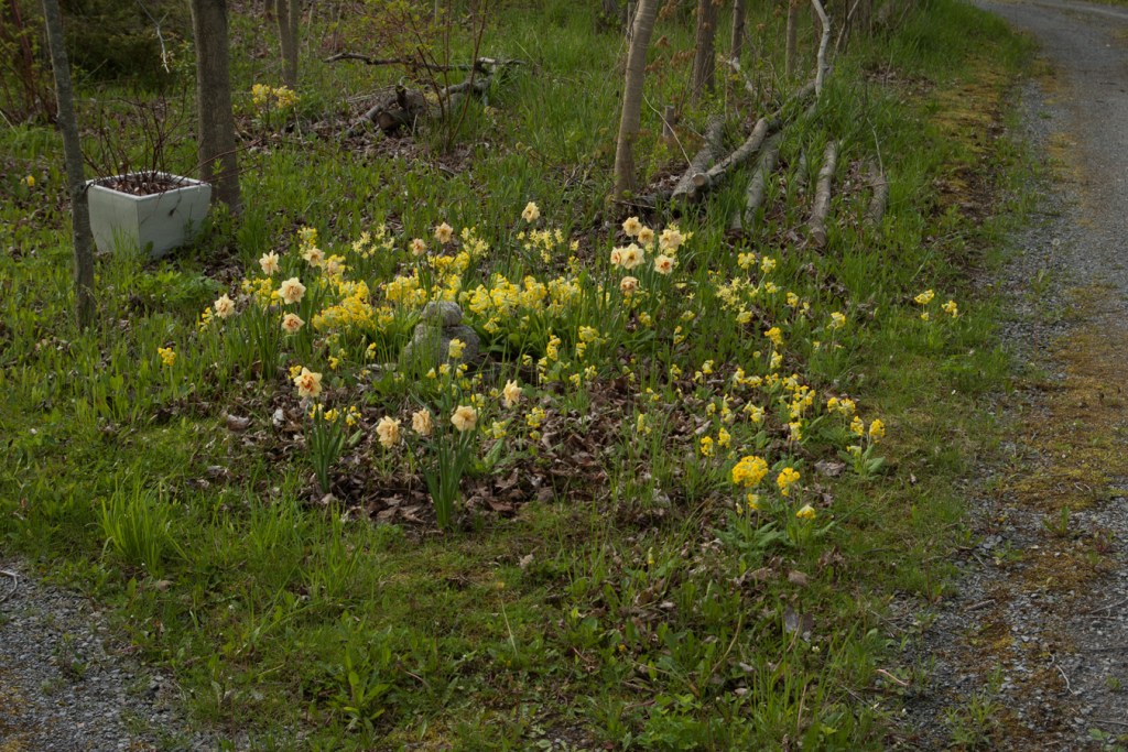 Seven or eight years ago, a neighbour down the road let me dig up a clump of the yellow Primula that dotted his property in the spring. Saved him pulling it out himself, he said, because it had self-seeded throughout his large but not completely well-cultivated vegetable garden. I planted the small clump near the leading corner of my ‘Island Bed,’ where the driveway splits to form a circle. The flowers proceeded to spread seed with abandon and in later years I added a few daffodils so that now, for much of May, it’s a little patch of yellow that foreshadows the much larger patches of daffs found elsewhere in the garden every spring.