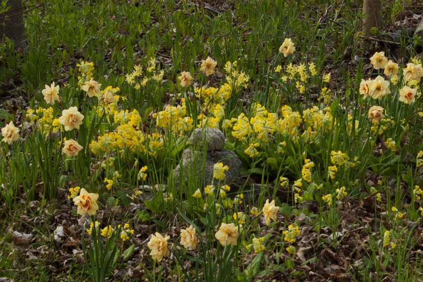 Seven or eight years ago, a neighbour down the road let me dig up a clump of the yellow Primula that dotted his property in the spring. Saved him pulling it out himself, he said, because it had self-seeded throughout his large but not completely well-cultivated vegetable garden. I planted the small clump near the leading corner of my ‘Island Bed,’ where the driveway splits to form a circle. The flowers proceeded to spread seed with abandon and in later years I added a few daffodils so that now, for much of May, it’s a little patch of yellow that foreshadows the much larger patches of daffs found elsewhere in the garden every spring.