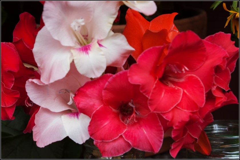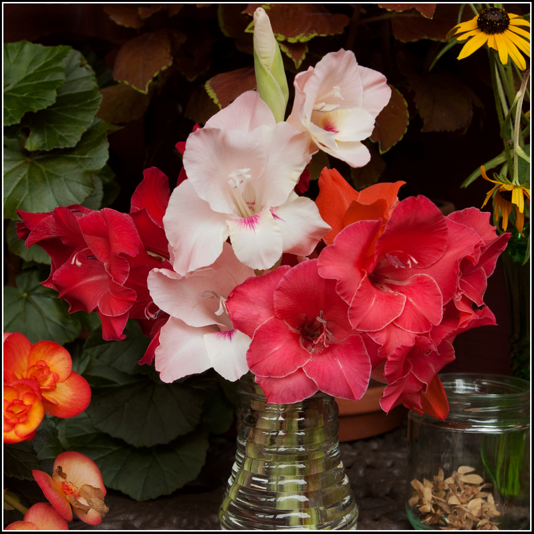 After making many comments in December and at the beginning of January about the lack of snow again this winter, I’m forced to eat my words. The past few weeks have, so far, been very Canadian wintery-like, with cold nights and a snowfall every few days. There are rabbit tracks galore in the garden and yard and not nearly enough coyote tracks for my liking – I’m already bracing for, breathing deeply and accepting the sight of rabbit-chewed shrubs and small trees in a few months as the snow melts. It’s a perfect opportunity to look back at this small jar of gladiolas I had on my back porch table last August 2, when it reached 28 decrees Celsius in the afternoon (it’ll reach minus two today). These flowers certainly started tall enough, like typical glads, but after the lower flowers faded I cut the stems short to make this small vase.