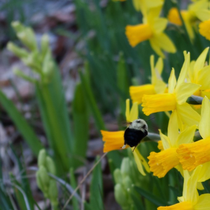 I truly love bumble bees, and that photo of the bee butt sticking out of the flower is perfect! I really like the ‘Ice Follies’ daffodil, too. It’s not only pretty, it makes me think of lemon meringue pie.