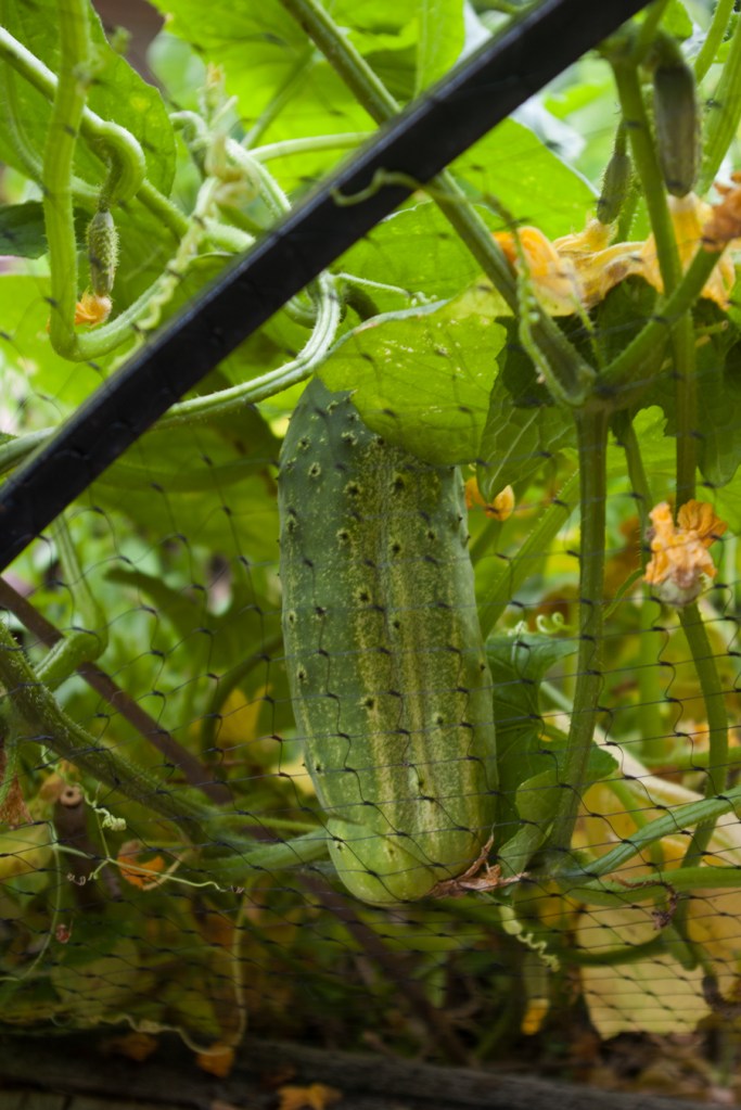 Also watered regularly are the veggies of course. (At least, for as long as there’s water in the rain barrels. Maybe one more week…) A friend brought be a cucumber she had started; planted at the beginning of June the vine is now huge and taking over my porch trellis. This is the first cucumber. A bit bitter from the heat, but nice to have nonetheless. My beans have, unfortunately, been discovered by the rabbits. They’re in a raised bed and have gone unnoticed in past years. I think critters are looking for moisture anywhere they can find it this summer though, and the succulent stems and leaves of the bush beans are too tempting.
