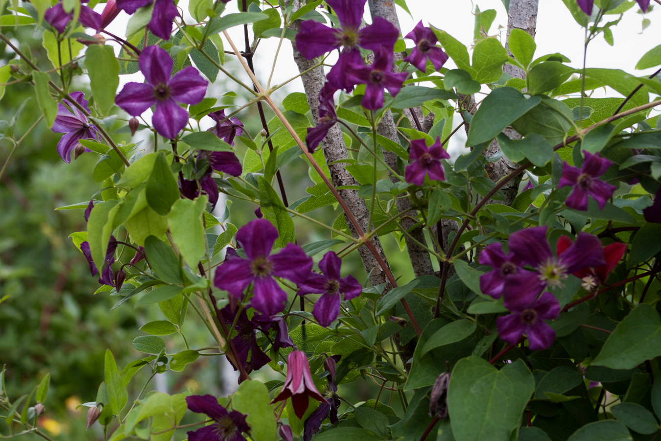 Not quite as drought tolerant are the Clematis. My texensis variety, Gravetye Beauty, only produced a handful of blooms. This viticella, Etoile Violette, is a bit better, albeit with fewer and smaller flowers.