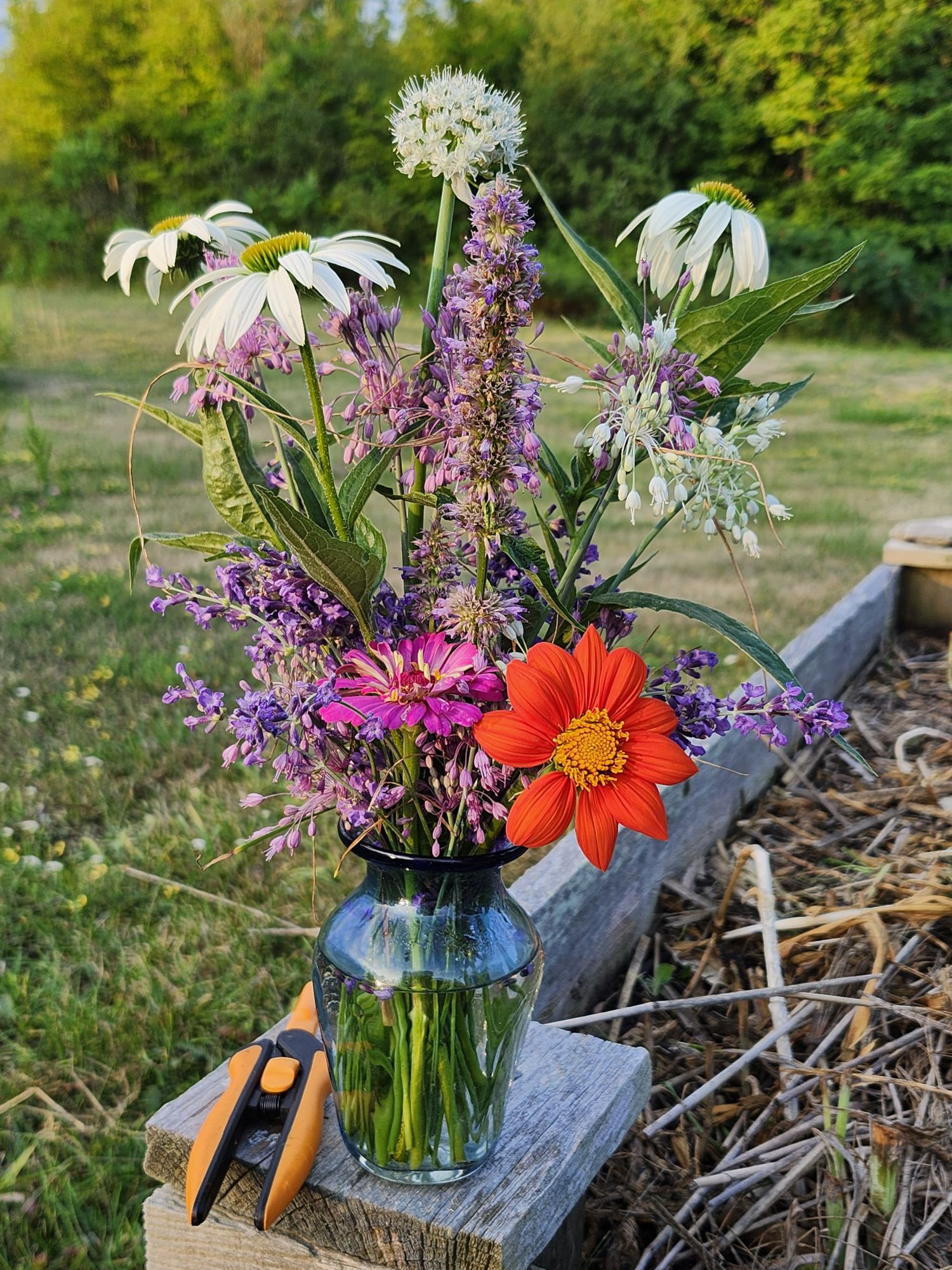 I snipped a handful of lavender, another handful of mauve and white Allium carinatum – keeled garlic, three white Echinacea stems, a single Agastache stem (lots of fragrance in today’s vase!) and a thick flower stalk from one of last year’s onions that was left in the garden over the winter.