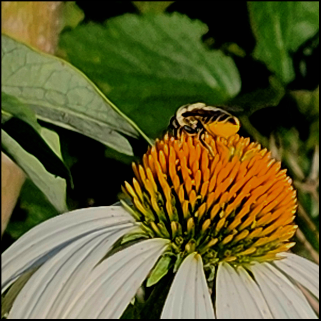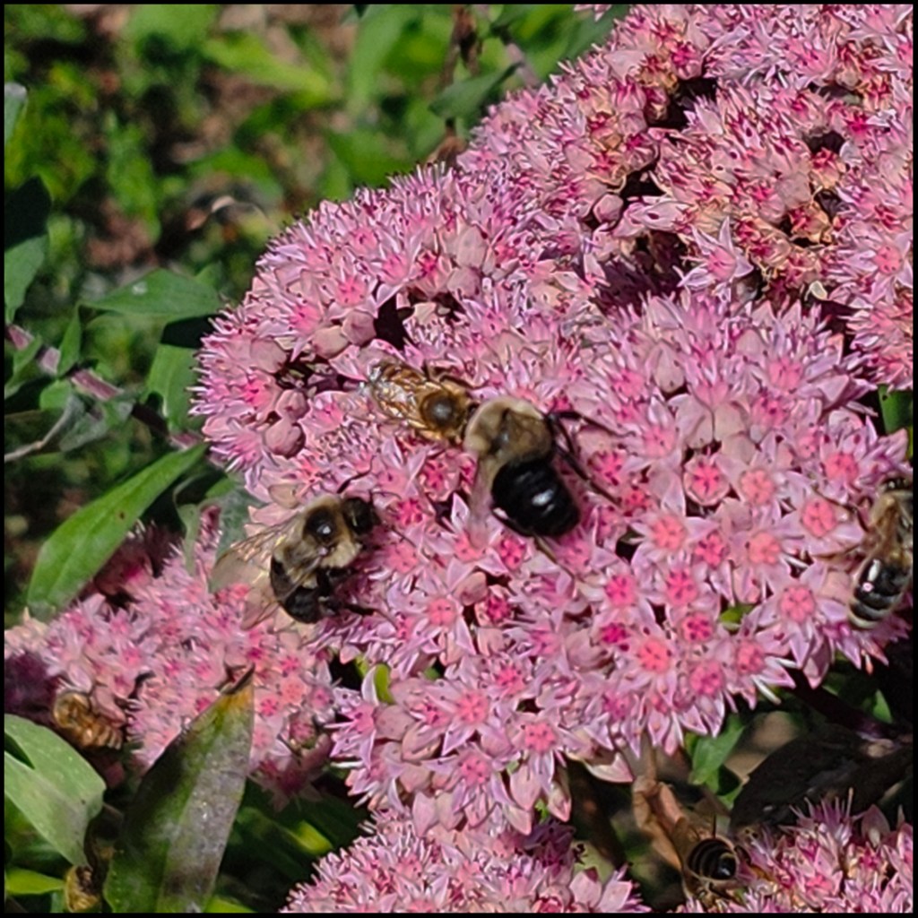Two more flowers, two new bees – a pollen laden bee carefully navigating the sharp bracts of a white coneflower – Echinacea Purpurea ssp, and as a three-fer, a trio of bees on this tall ruddy leaved sedum – Hylotelephium spectabile: