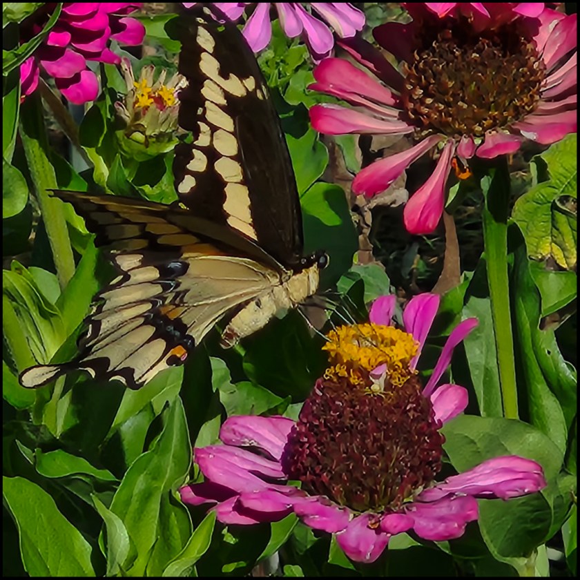 There’s a half dozen or more butterfly species that make a habit of visiting, but I can only reliably and immediately identify two – swallowtails and monarchs. There are several swallowtail species native here, including the one at the top of this post, feasting on a Zinnia, and the one below, fluttering around a blue vervain – Verbena hastata. The monarch, below, was quite comfortable in the Zinnia patch!