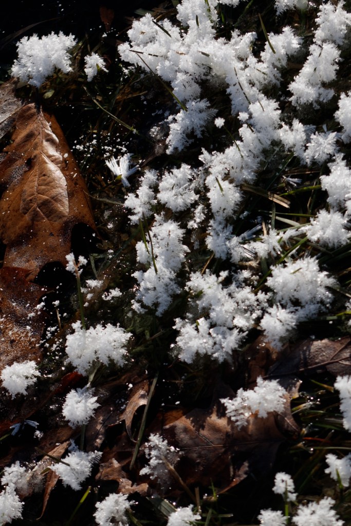 The individual snowflakes in the grass look like tiny white flowers. Although white is my favorite color, snow looks scary. It does not snow here, but if it did, I would probably stay inside. I know I would not drive in it.
