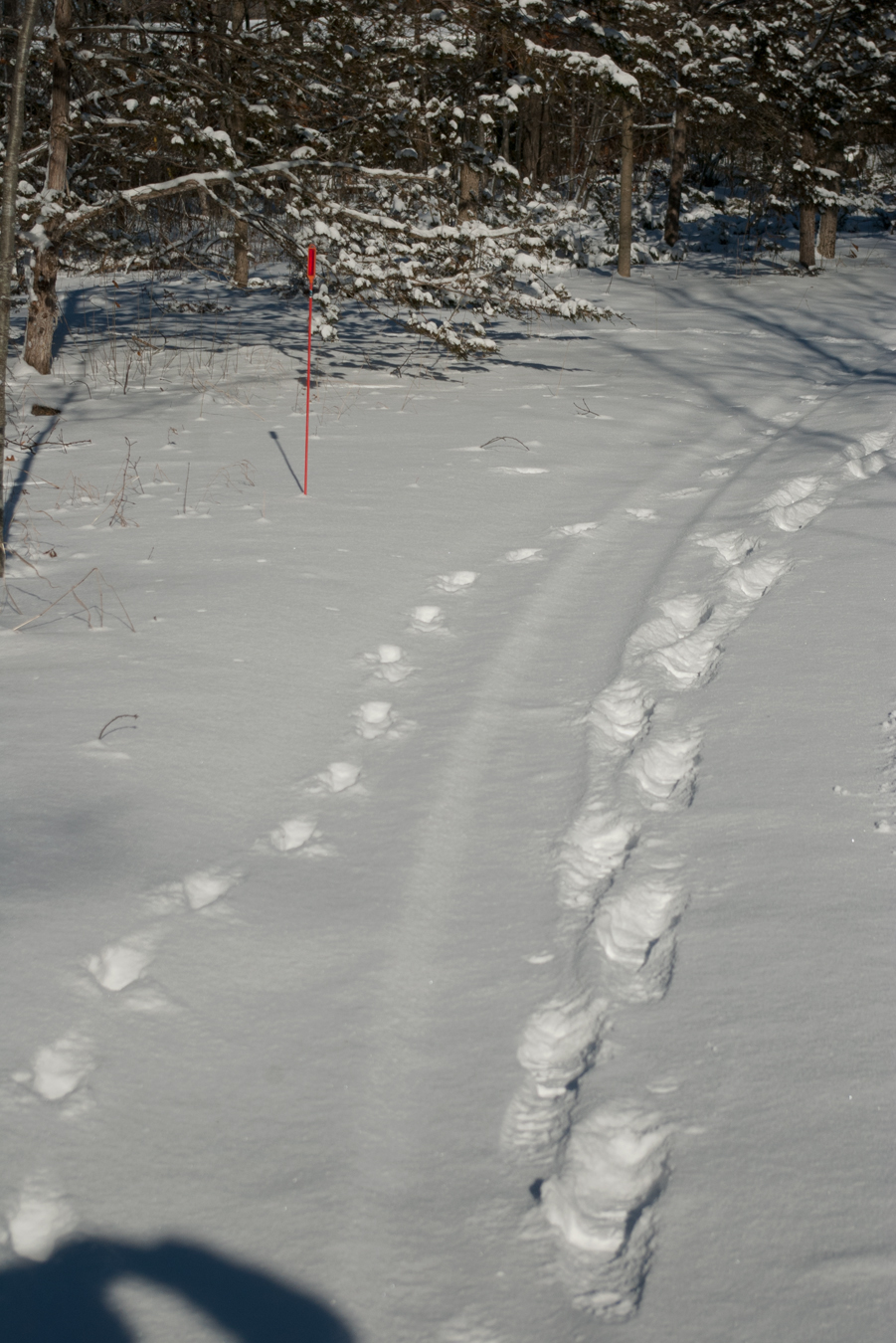 The first photo of the stream is beautiful, although I’m quite taken with the little snow ‘caps’ on the plants as well. Our coyotes are around, but not so easily tracked, especially since we’ve had little rain, and there’s no mud to record their passing. What’s the purpose of the red stake? I certainly hope it’s marking the trail or a specific ‘something,’ and isn’t a snow gauge!