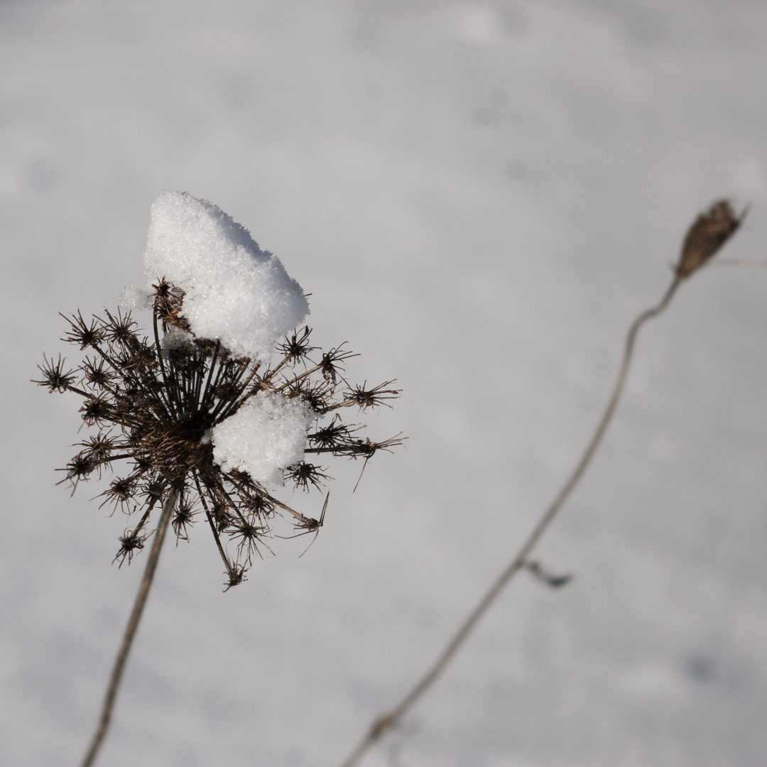 Even the long dead flat flower clusters of Queen Anne’s Lace – Daucus carota – look great after a snow fall…