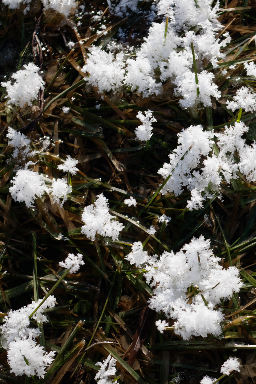 The individual snowflakes in the grass look like tiny white flowers. Although white is my favorite color, snow looks scary. It does not snow here, but if it did, I would probably stay inside. I know I would not drive in it.