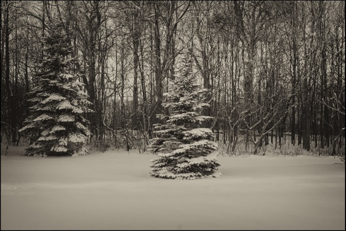 I think spruce trees, even in black and white, are about the prettiest tree out there after a snowfall.