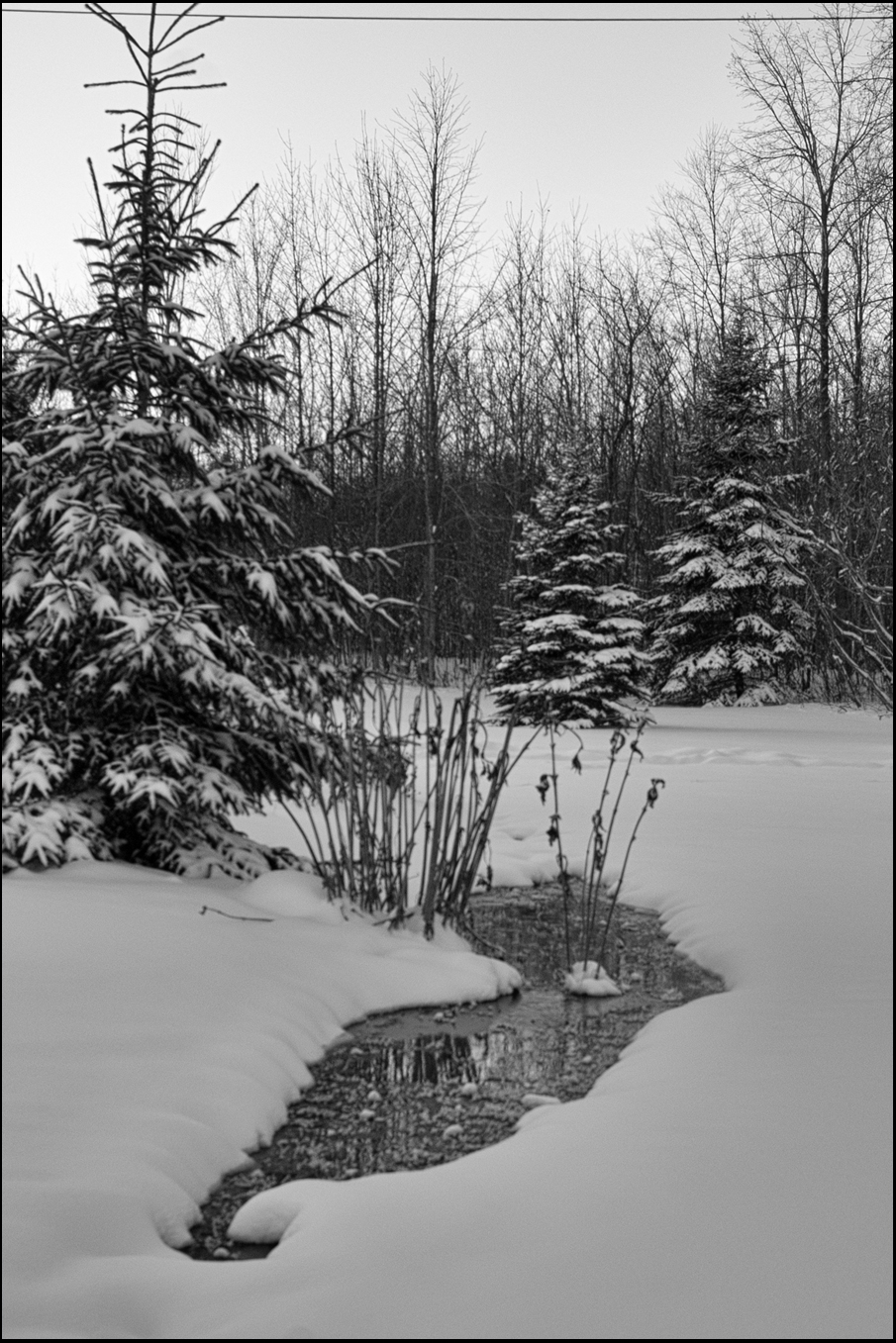 You’d be forgiven if you thought the ground was frozen solid for metres and metres, but in fact there’s moving water not too far from the surface, as this little pond demonstrates. It’s created by the sump pump draining water that would otherwise flood the basement.