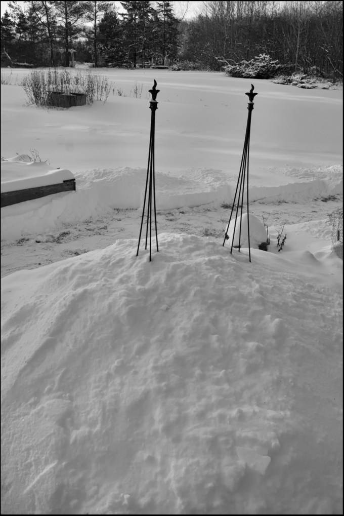 We don’t typically get a LOT of snow in my part of Canada – maybe a metre over the course of a winter, but temperatures fluctuate so much that it’s rarely a metre deep at any one time. For example, it’s supposed to climb above zero this afternoon, with maybe even a bit of rain. So it snows, some melts. It snows, some melts. Here’s a snow pile made from me shoveling the path down to the driveway…it never gets that deep just by falling from the sky. Just think, in just six months these iron rods will be supporting luscious tomatoes…