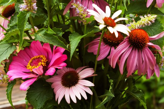 White Echinacea and colourful Zinneas are taking centre stage in my August gardens