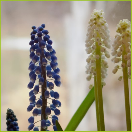 Pots of Muscari on the windowsill brighten up the house on early spring days.